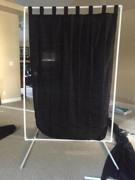 Below are the parts you will need to make ONE side.  I use 4, two per side of my “stage” area. You can get all the parts, except the drapes, at a hardware store. The curtains you can find at places like Bed, Bath & Beyond, Target, or Walmart. All in all, each side is no more than $10-15.